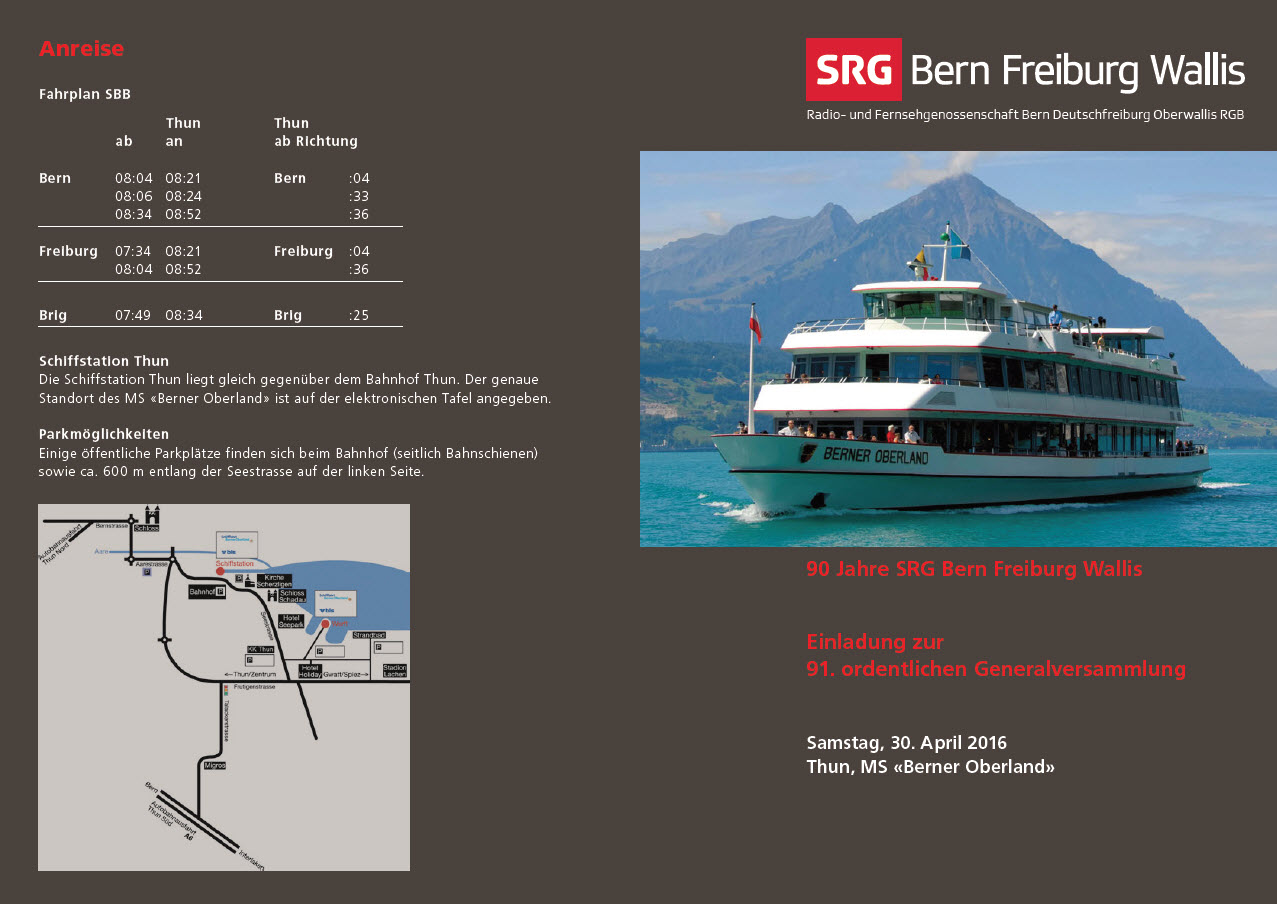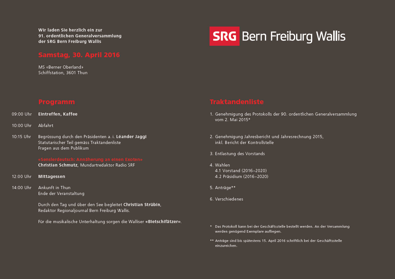 Wir laden unsere Mitglieder herzlich zur 91. ordentlichen Generalversammlung der SRG Bern Freiburg Wallis ein.